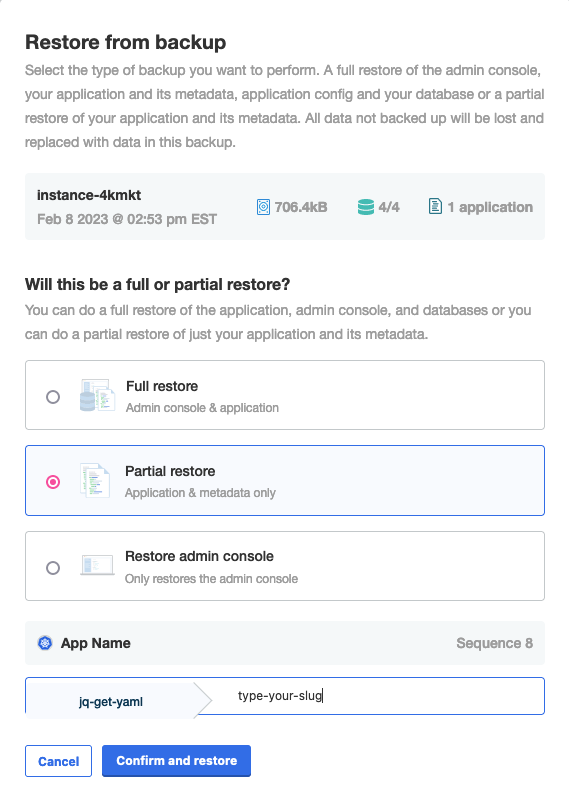 - Restore both the application and the KOTS Admin Console (also referred to as a full restore)